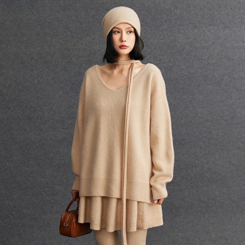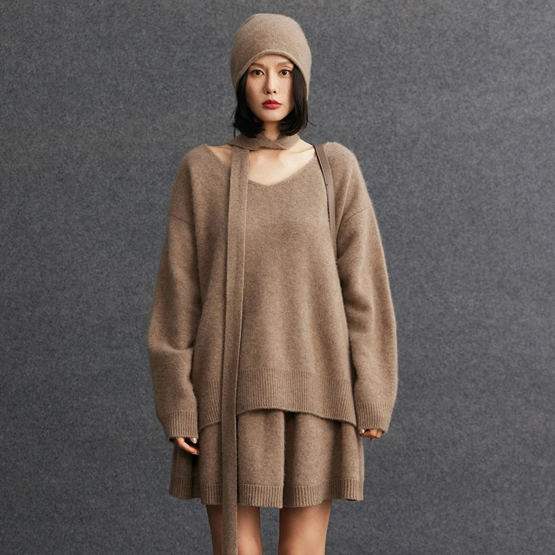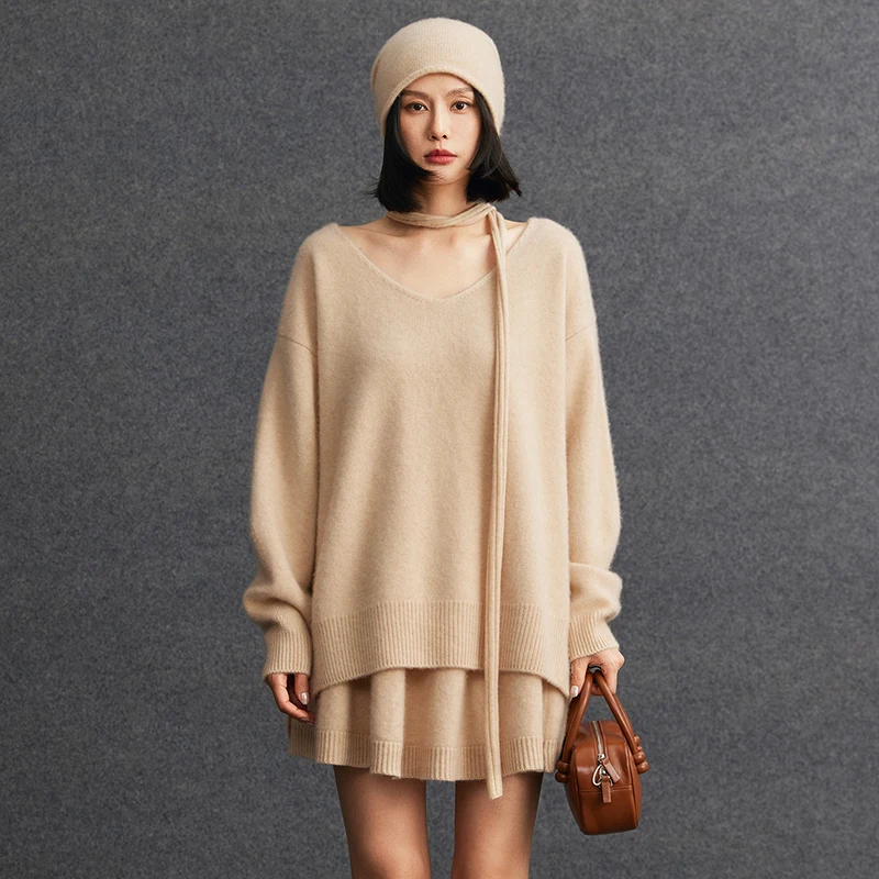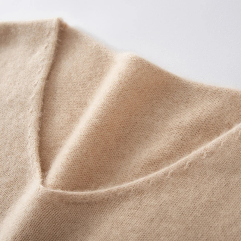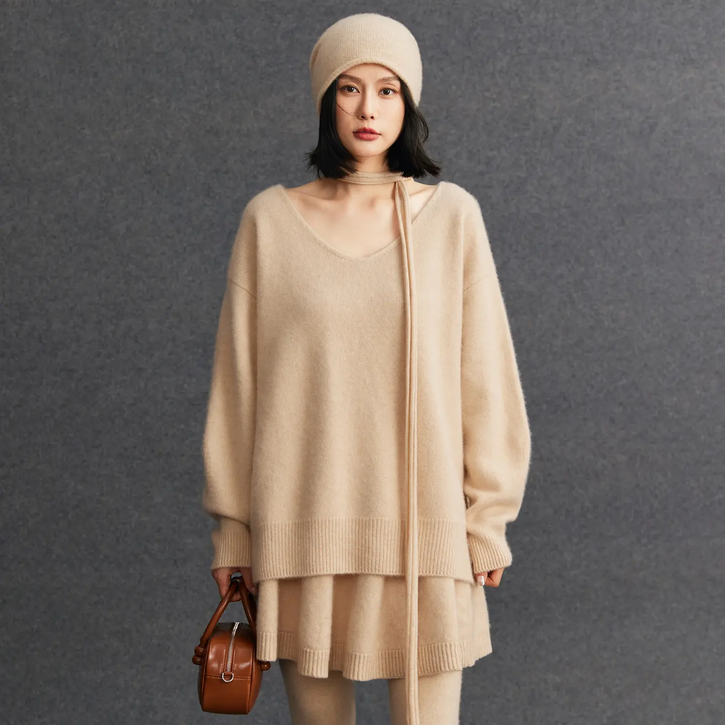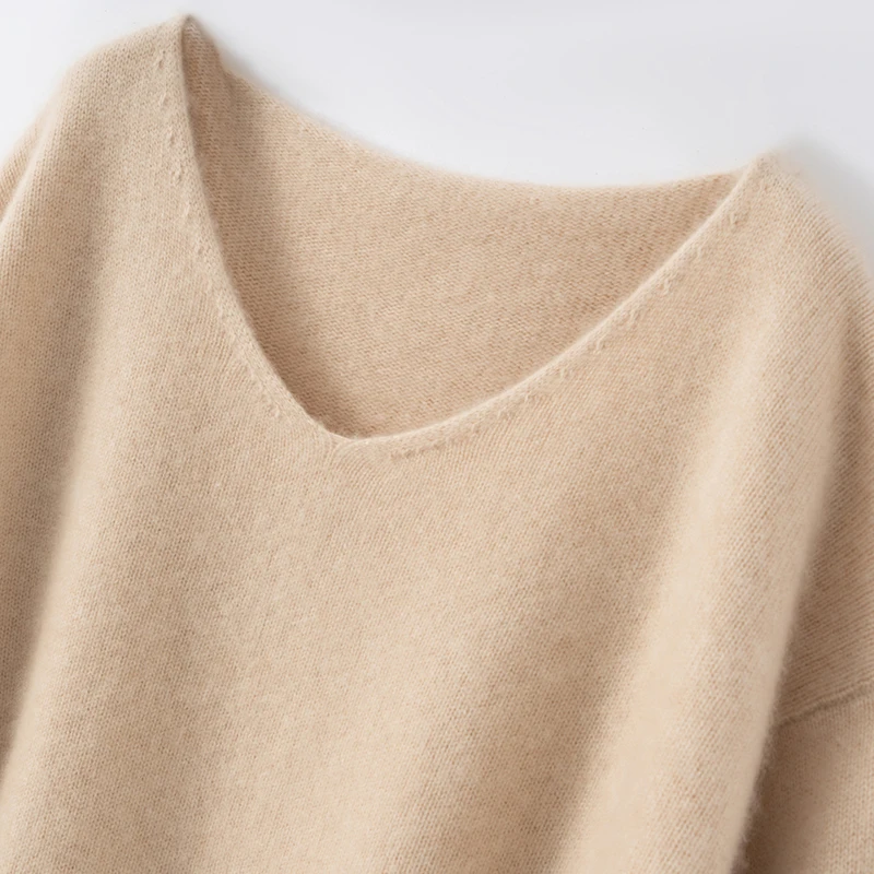 Women's V-Neck Solid Long Sleeve Thick Soft Knit Loose Goat Cashmere Sweater