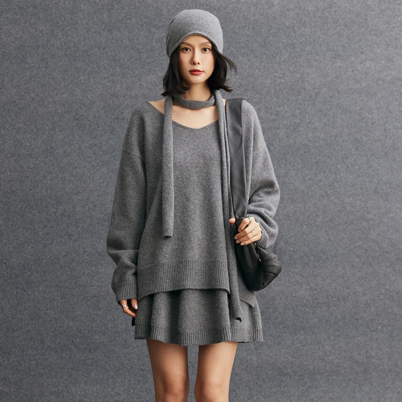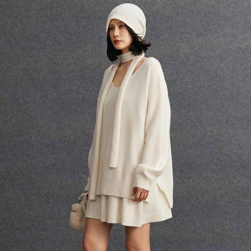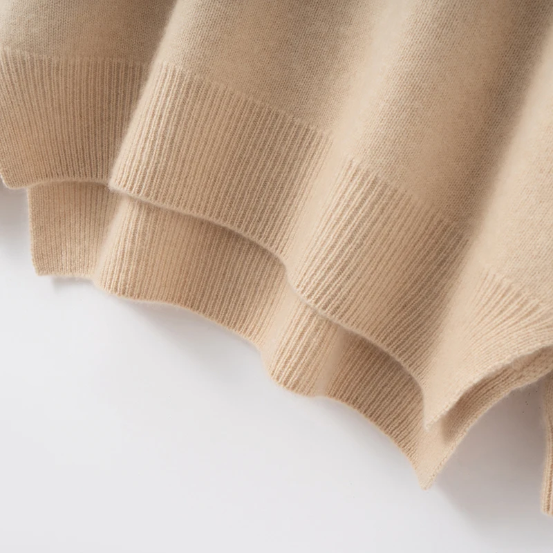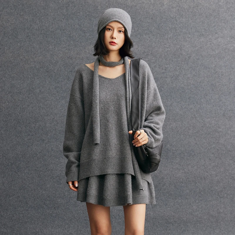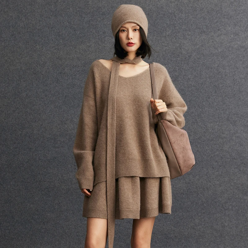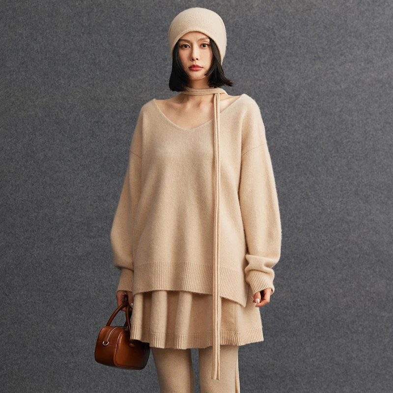 Women's V-Neck Solid Long Sleeve Thick Soft Knit Loose Goat Cashmere Sweater