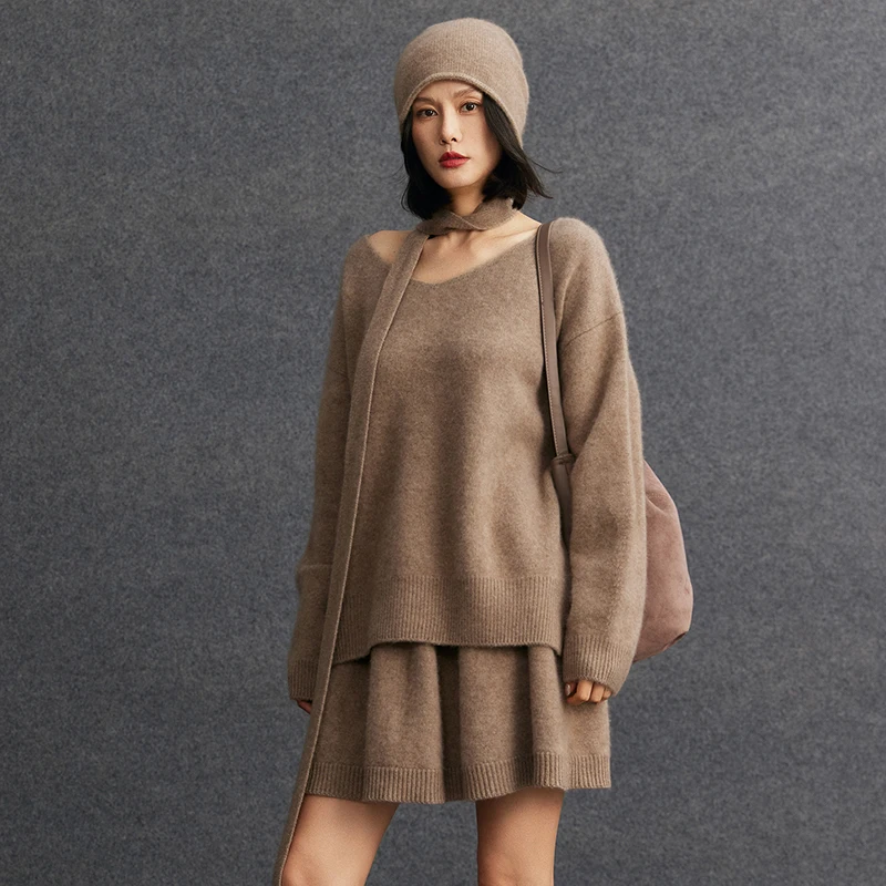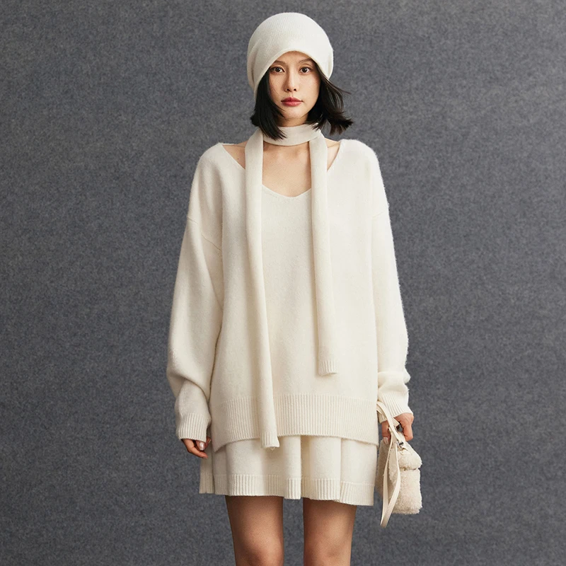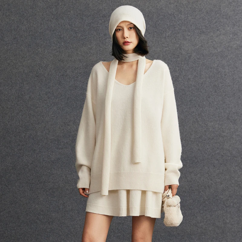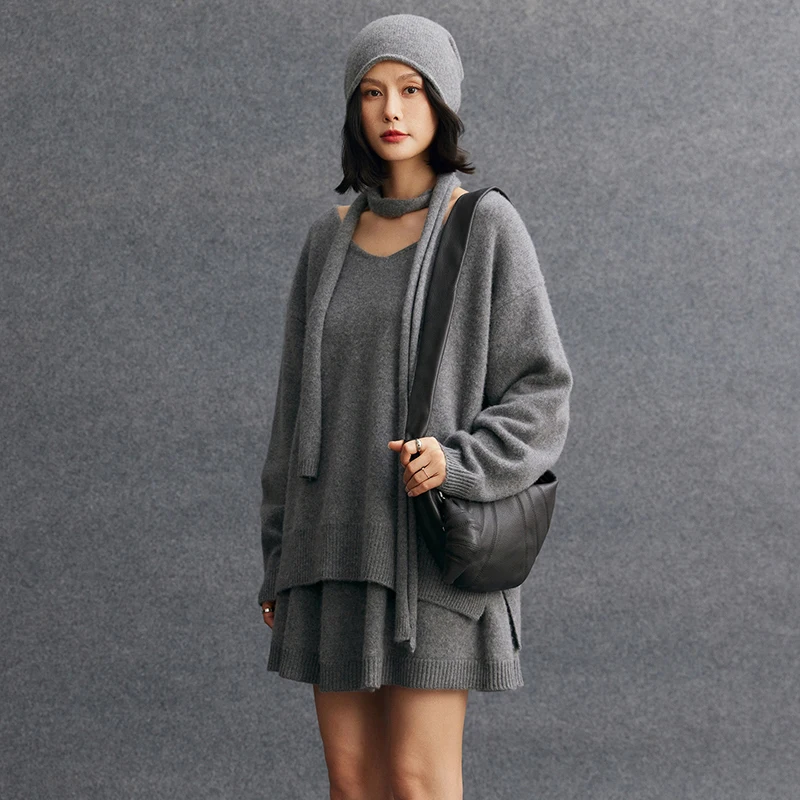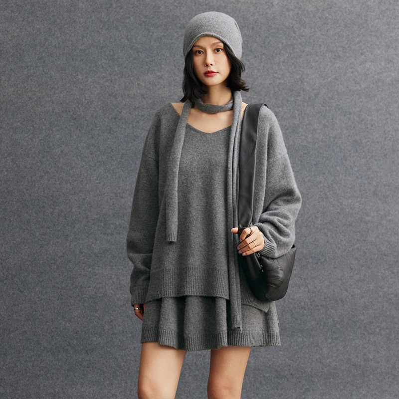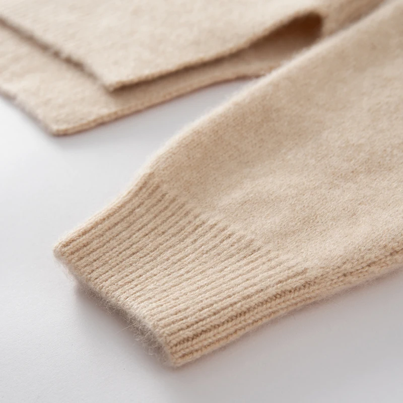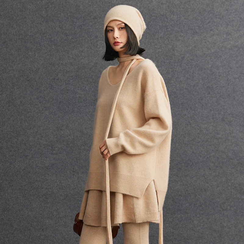 Women's V-Neck Solid Long Sleeve Thick Soft Knit Loose Goat Cashmere Sweater