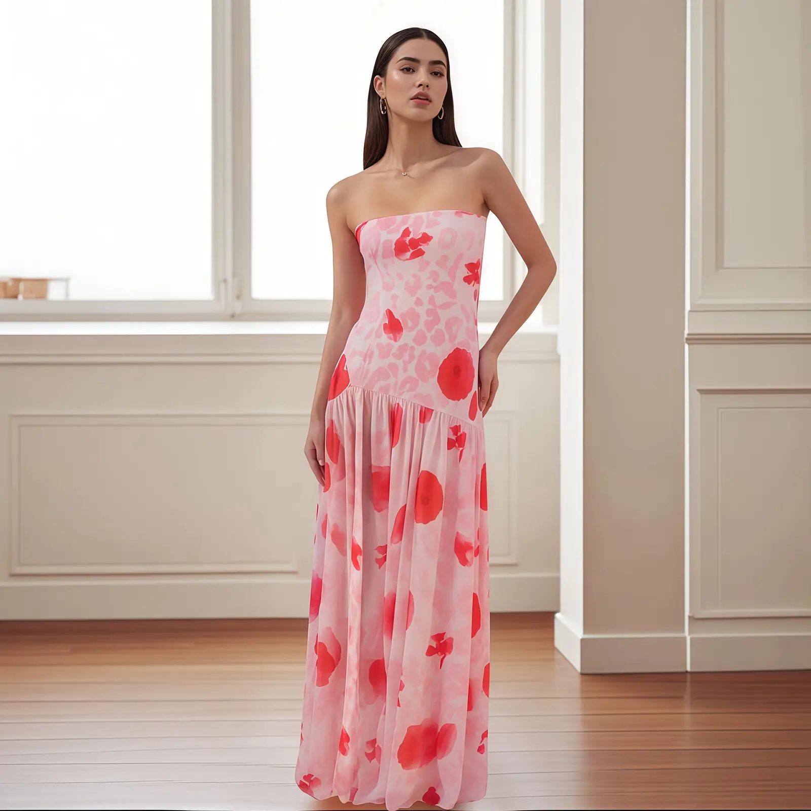 Women Strapless Floral High-Slit Backless Maxi Dress