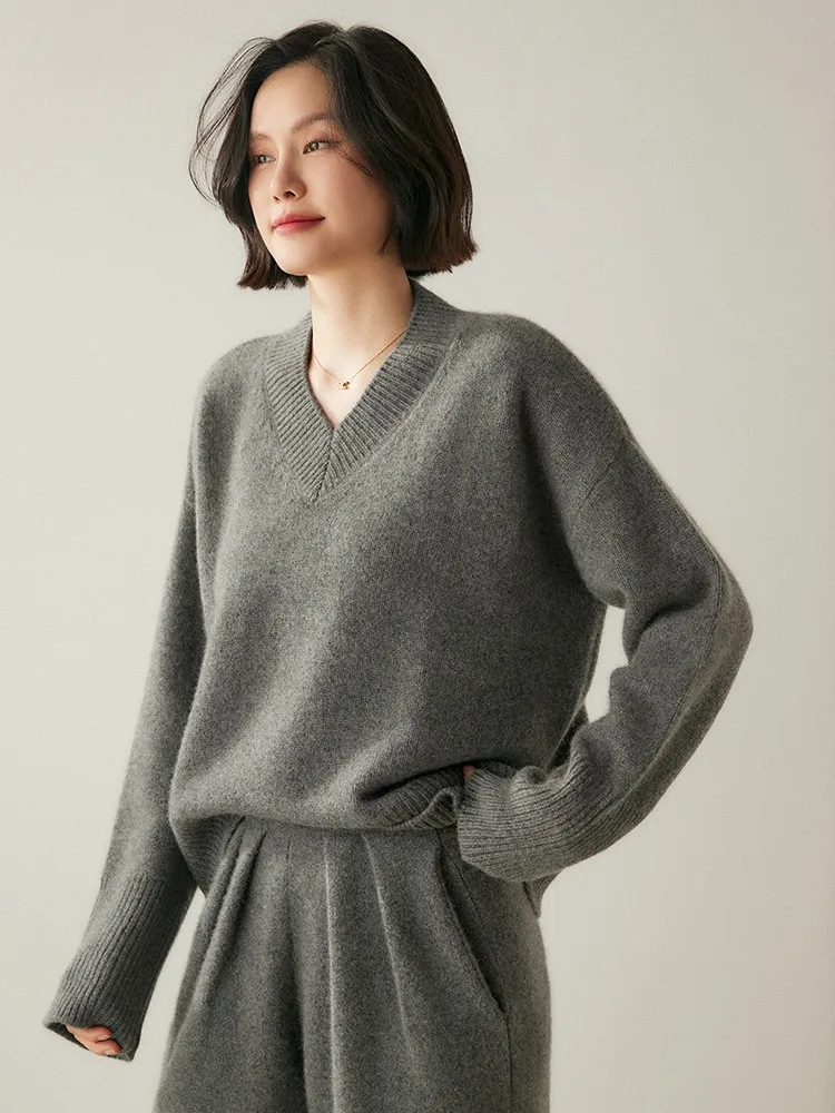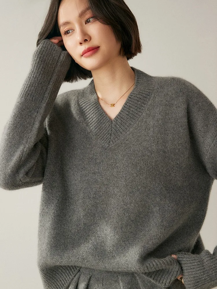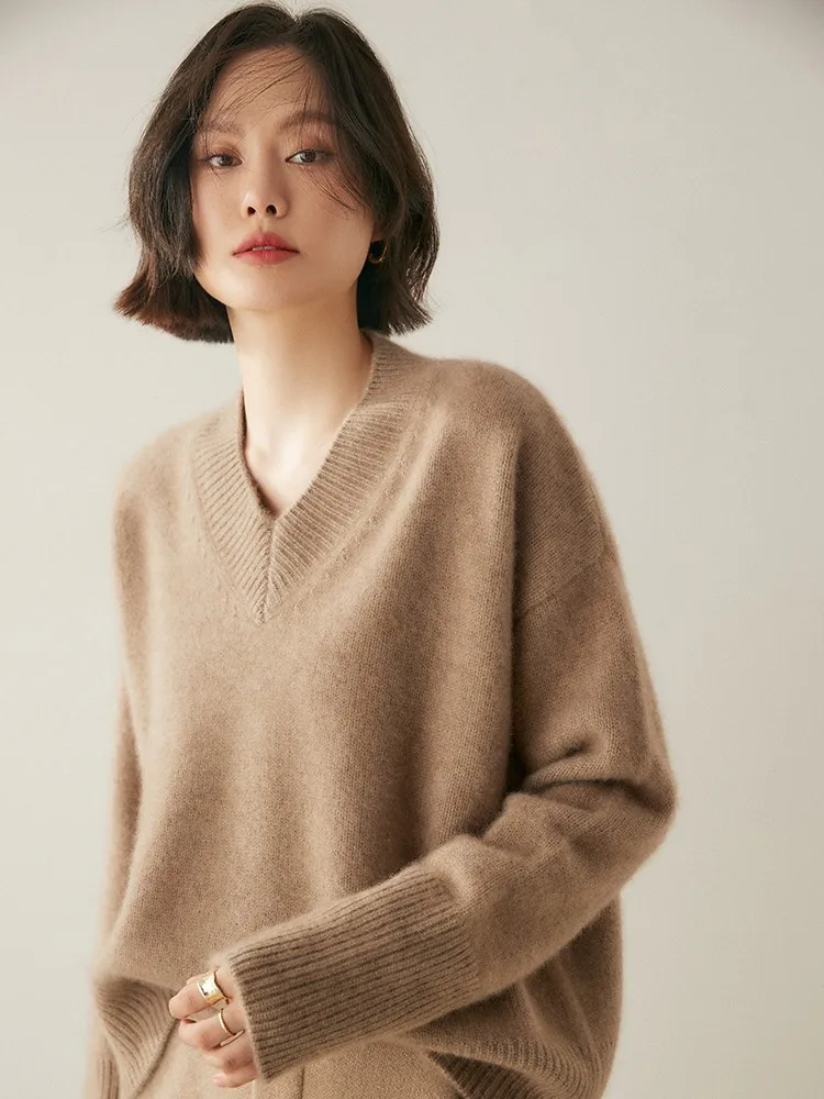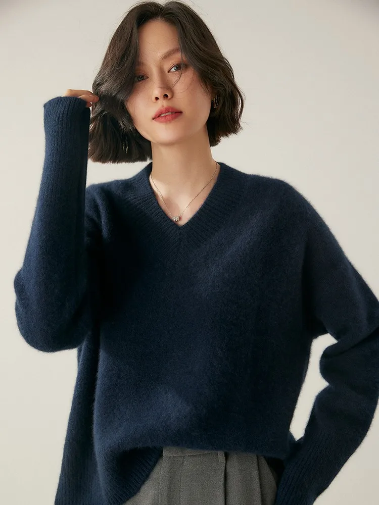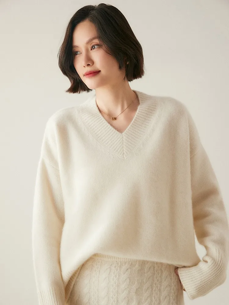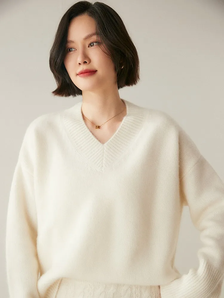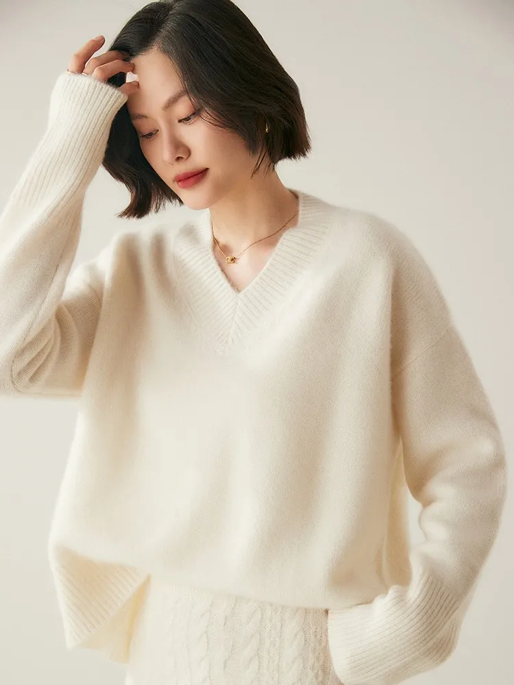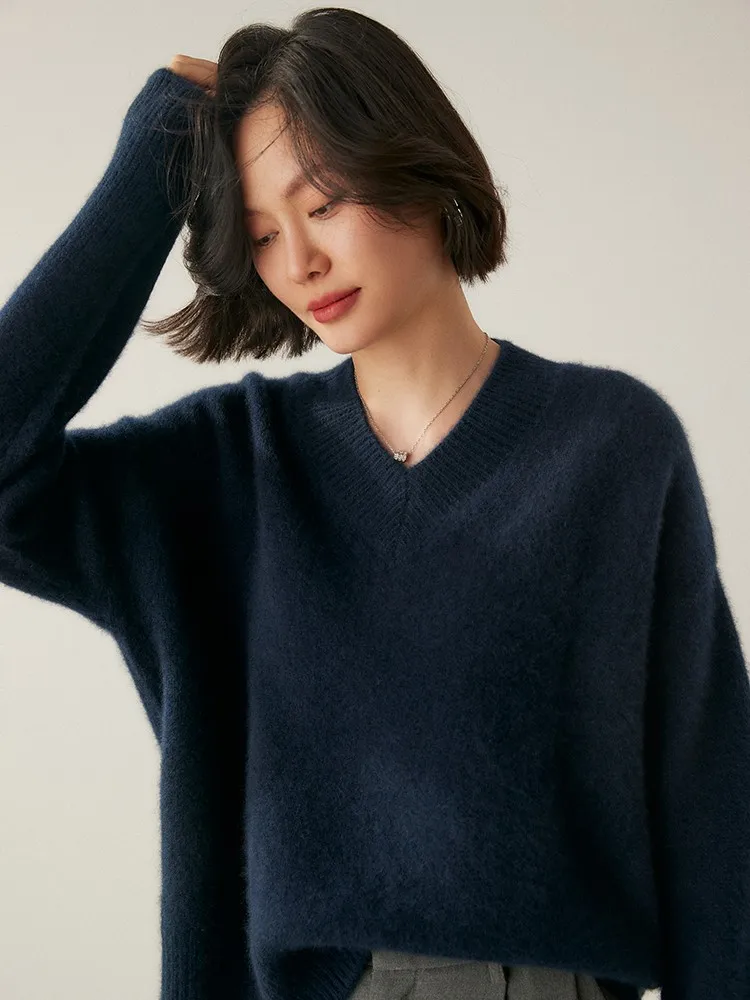 Women's V-Neck Long Sleeve Loose Thicken Warm Knit Pullover Sweater