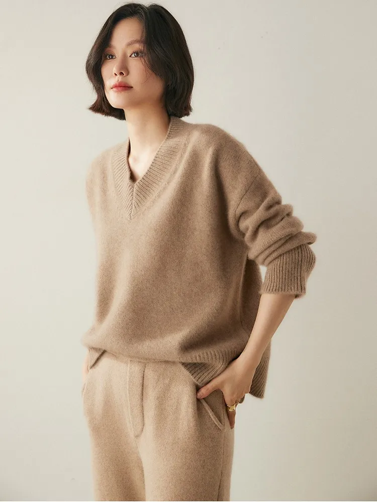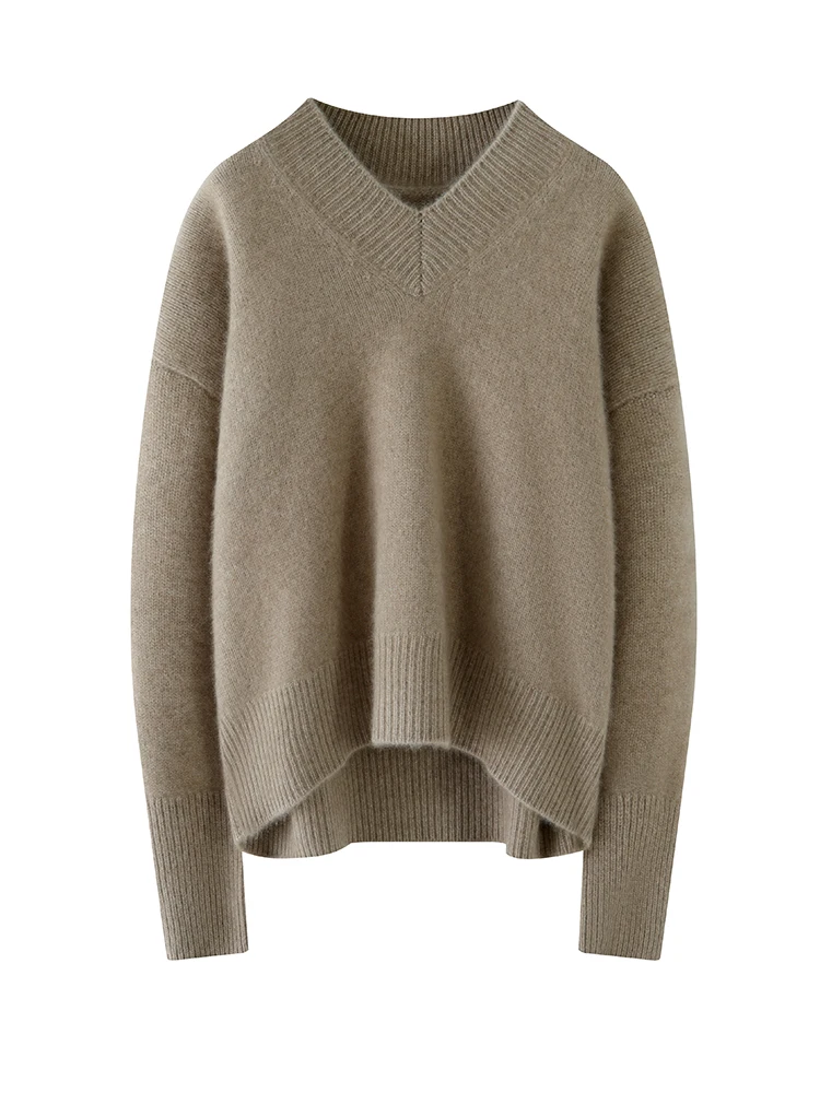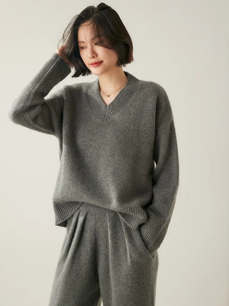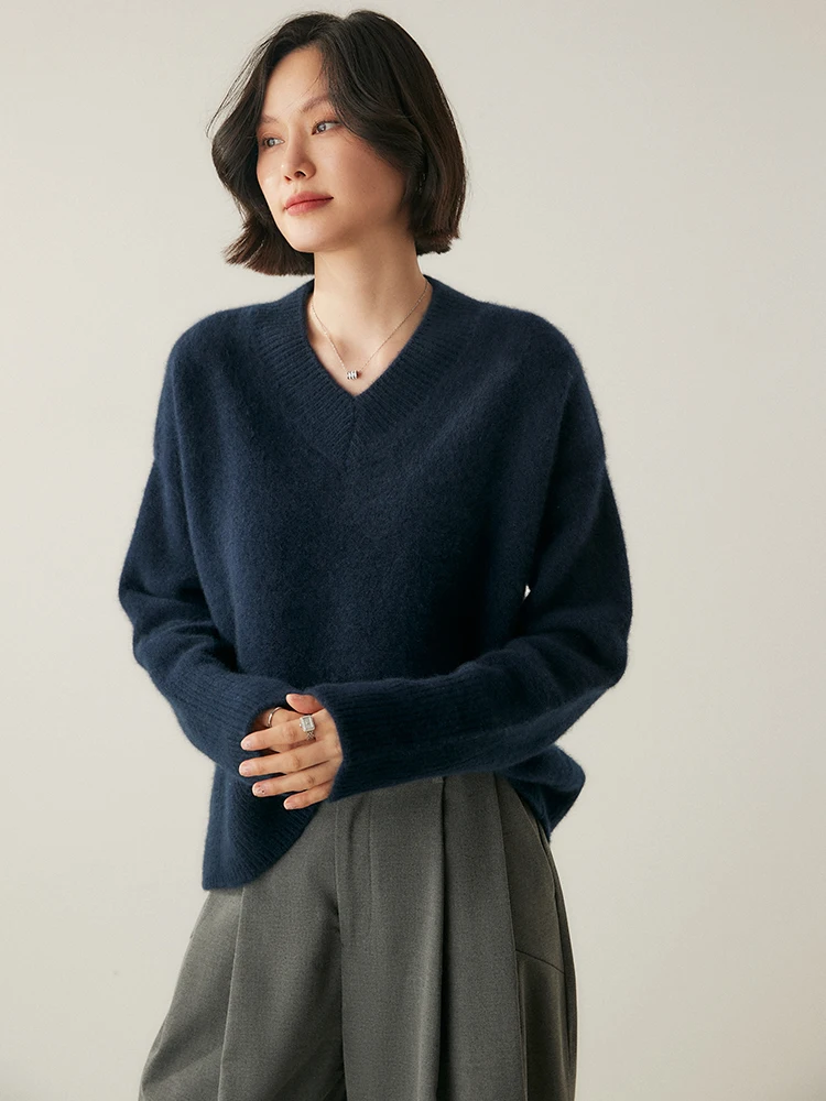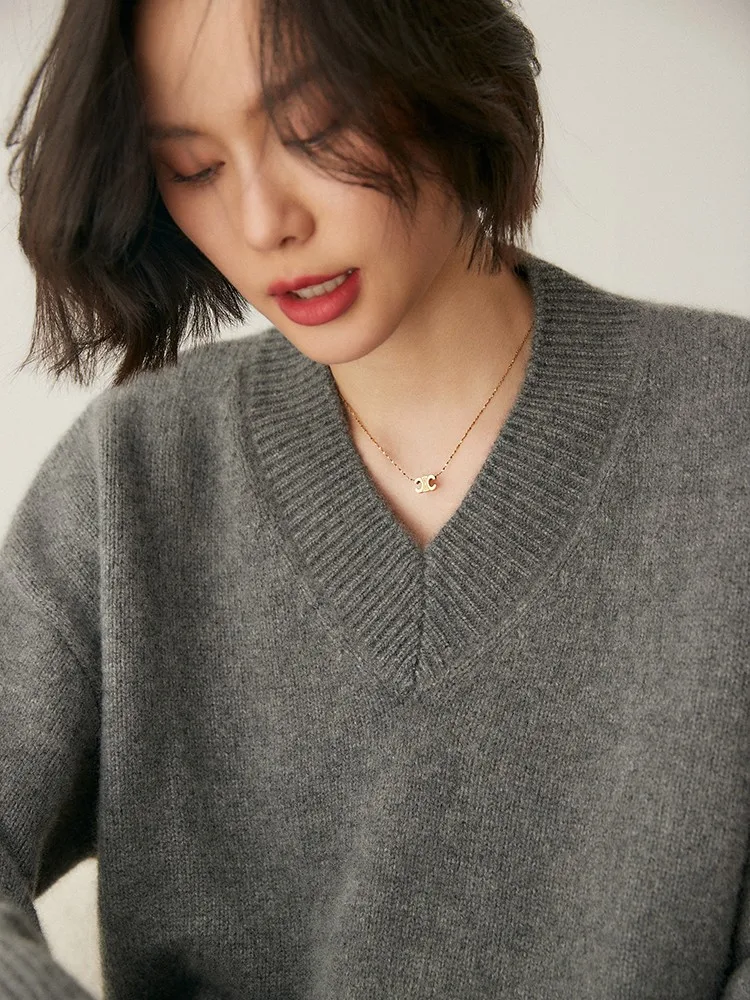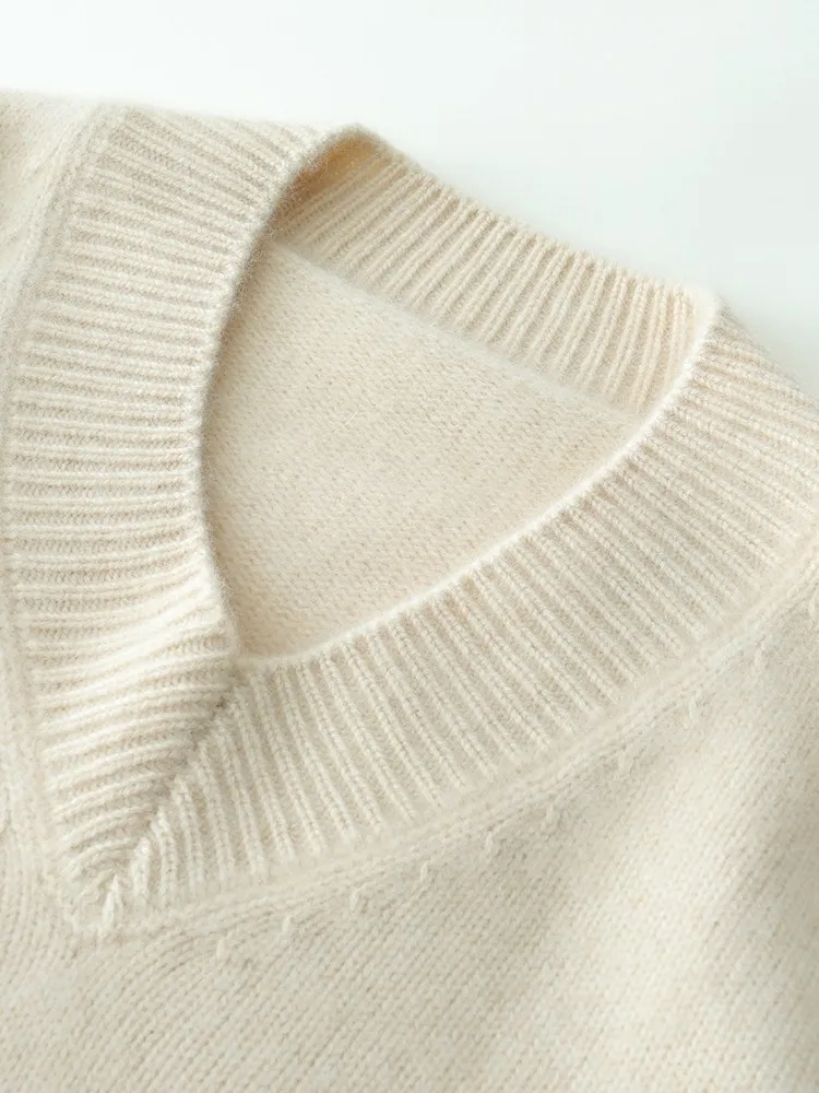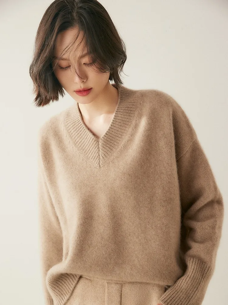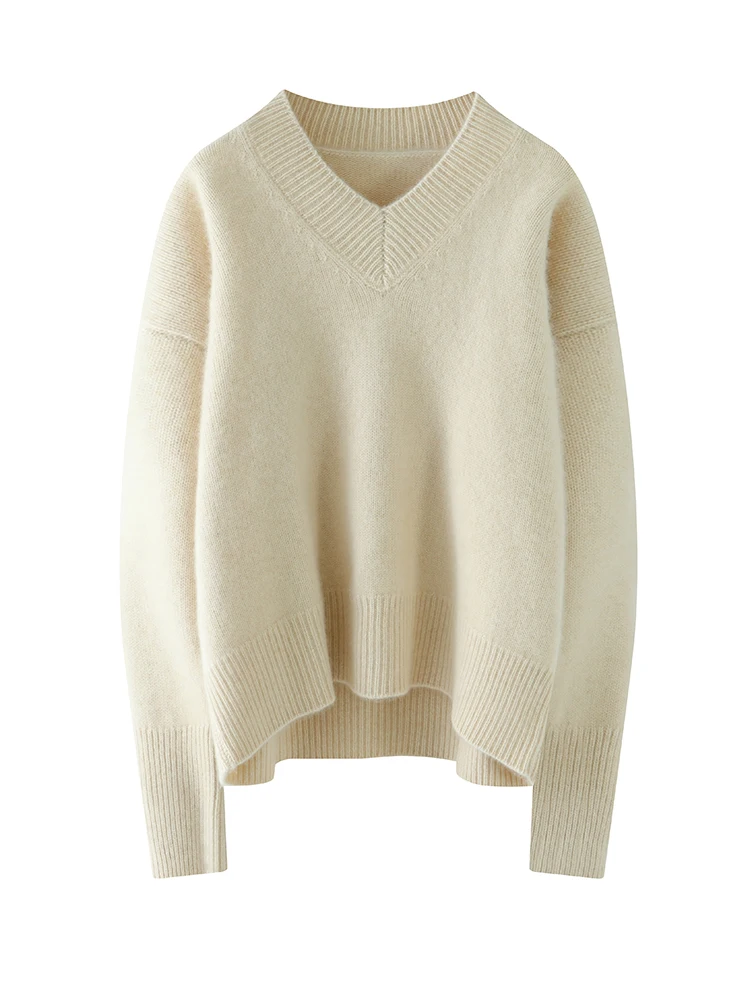 Women's V-Neck Long Sleeve Loose Thicken Warm Knit Pullover Sweater