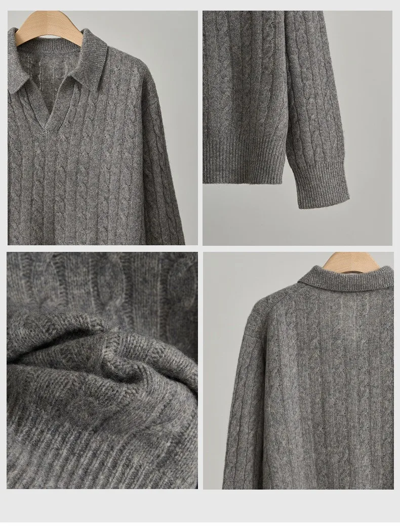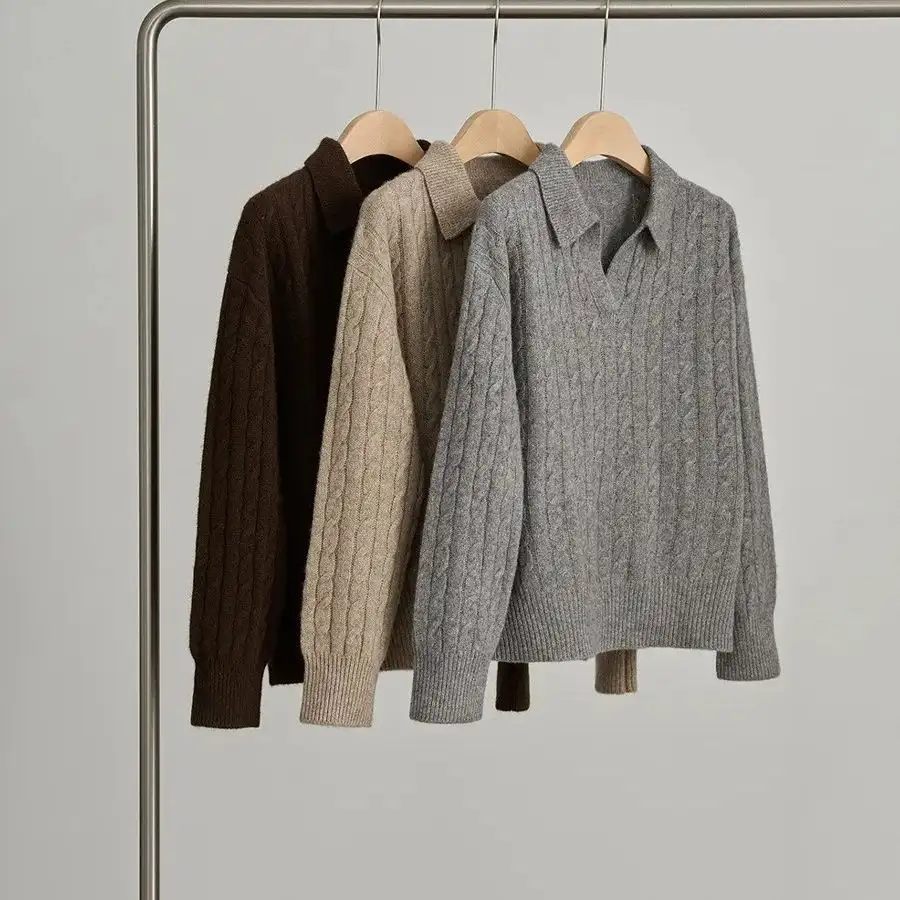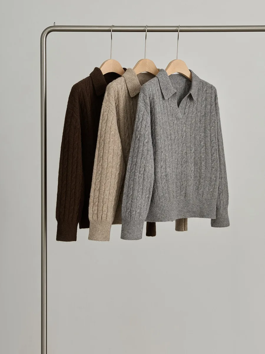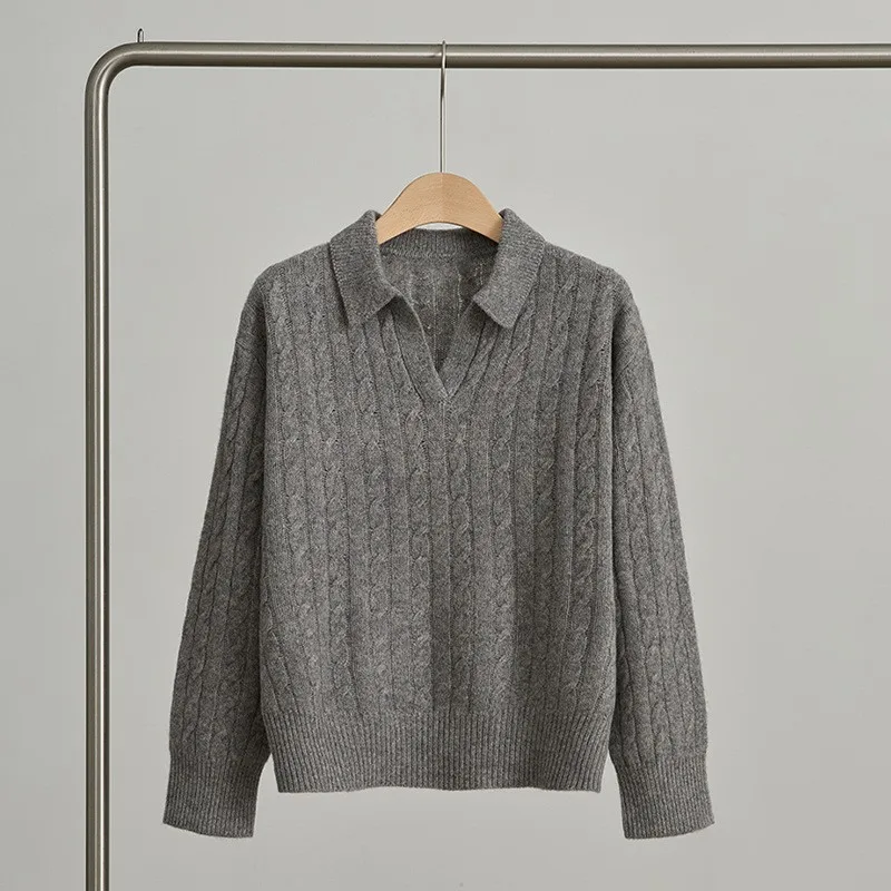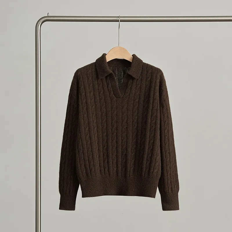 Women's Turn-Down Collar Twist Long Sleeve Thickened Pullover Sweater