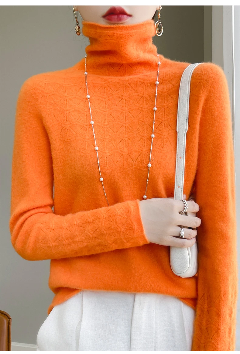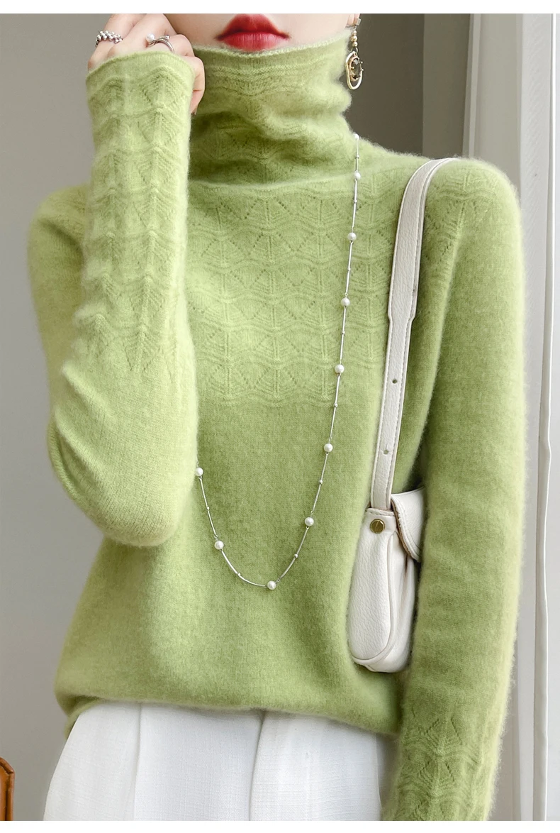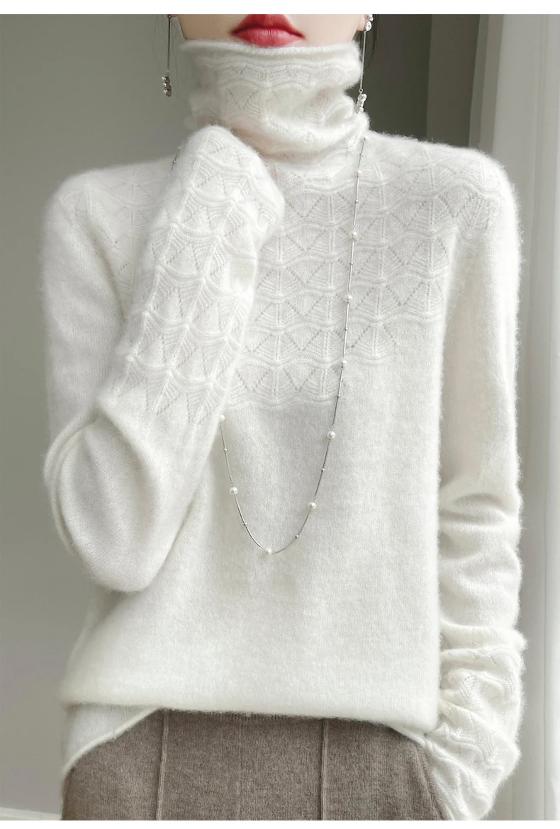 Women's High Neck Long Sleeve Solid Color Warm Elegant Hollow Wool Pullover