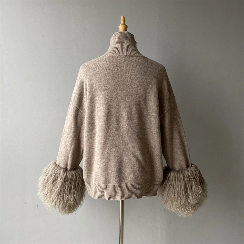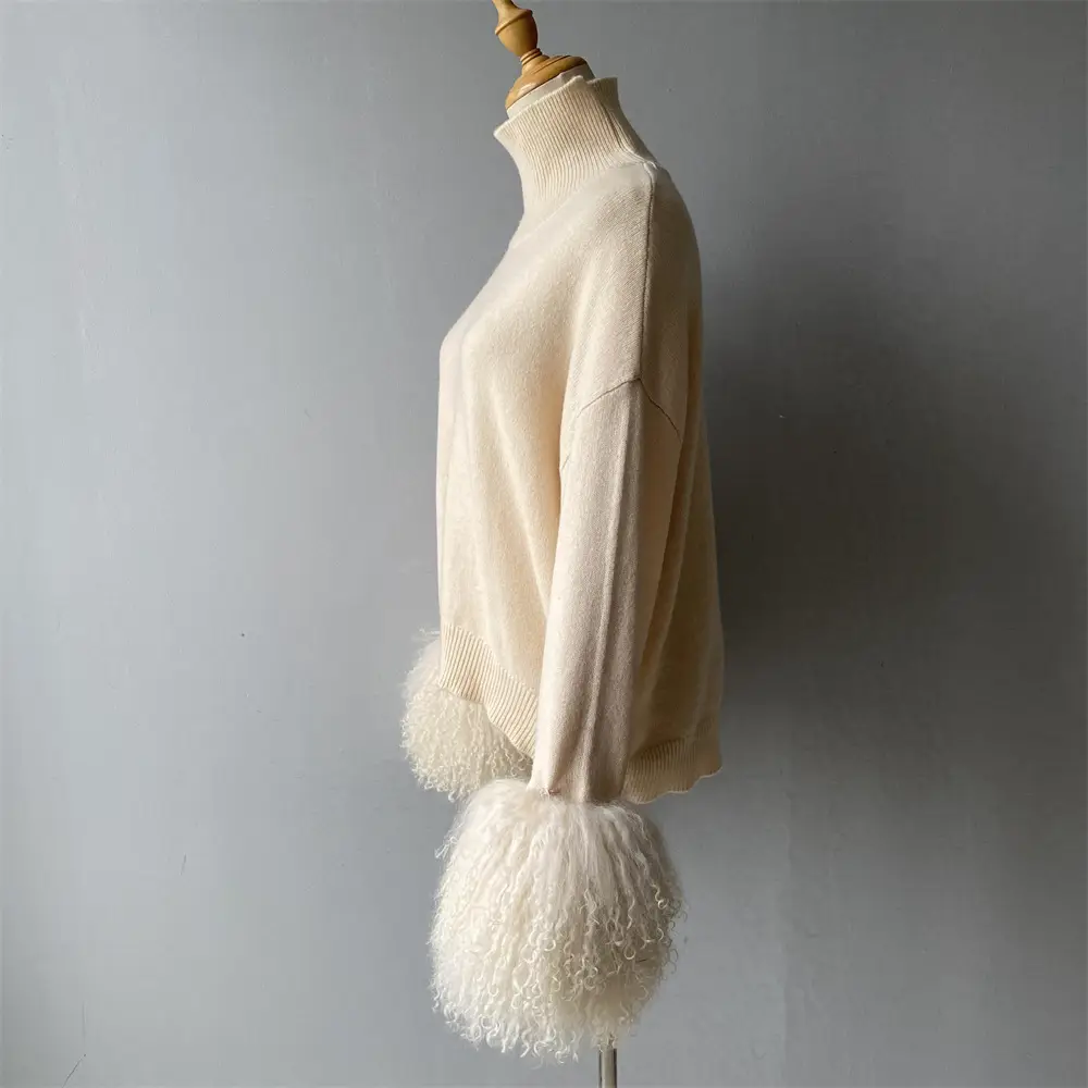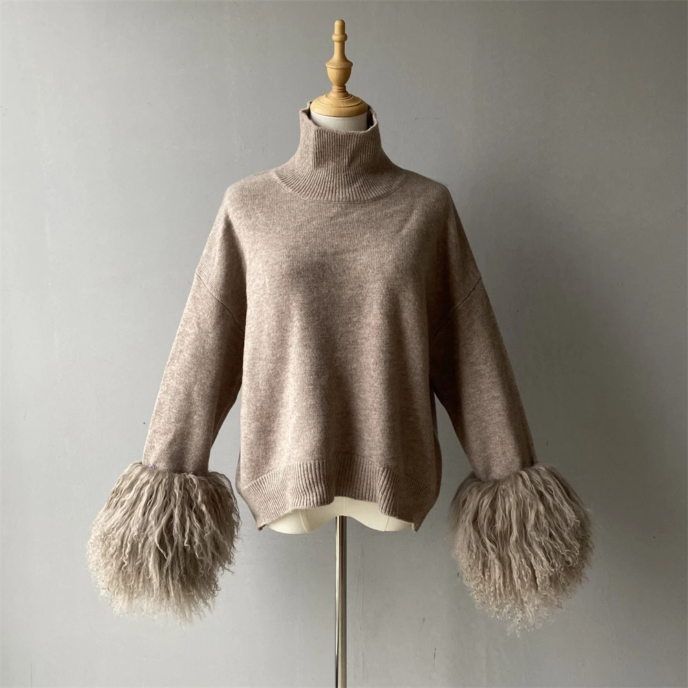 Women's Sheep Fur Cuff Turtleneck Knitted Fashion Warm Pullover