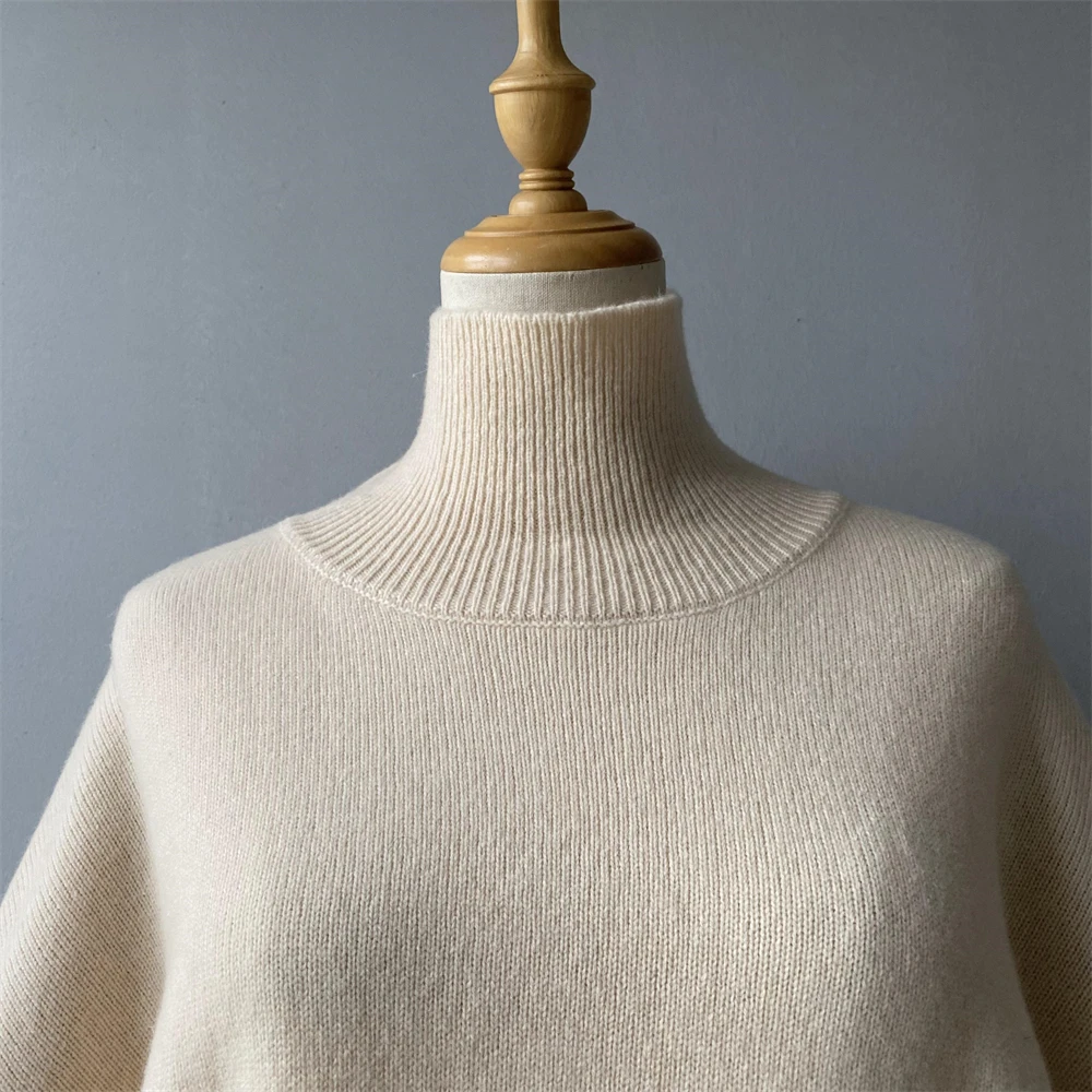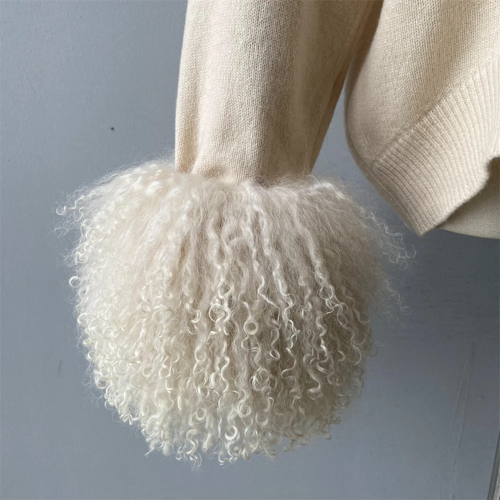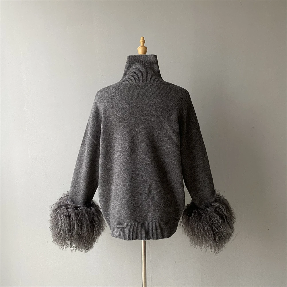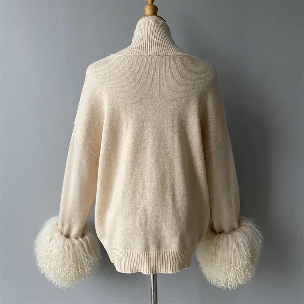 Women's Sheep Fur Cuff Turtleneck Knitted Fashion Warm Pullover